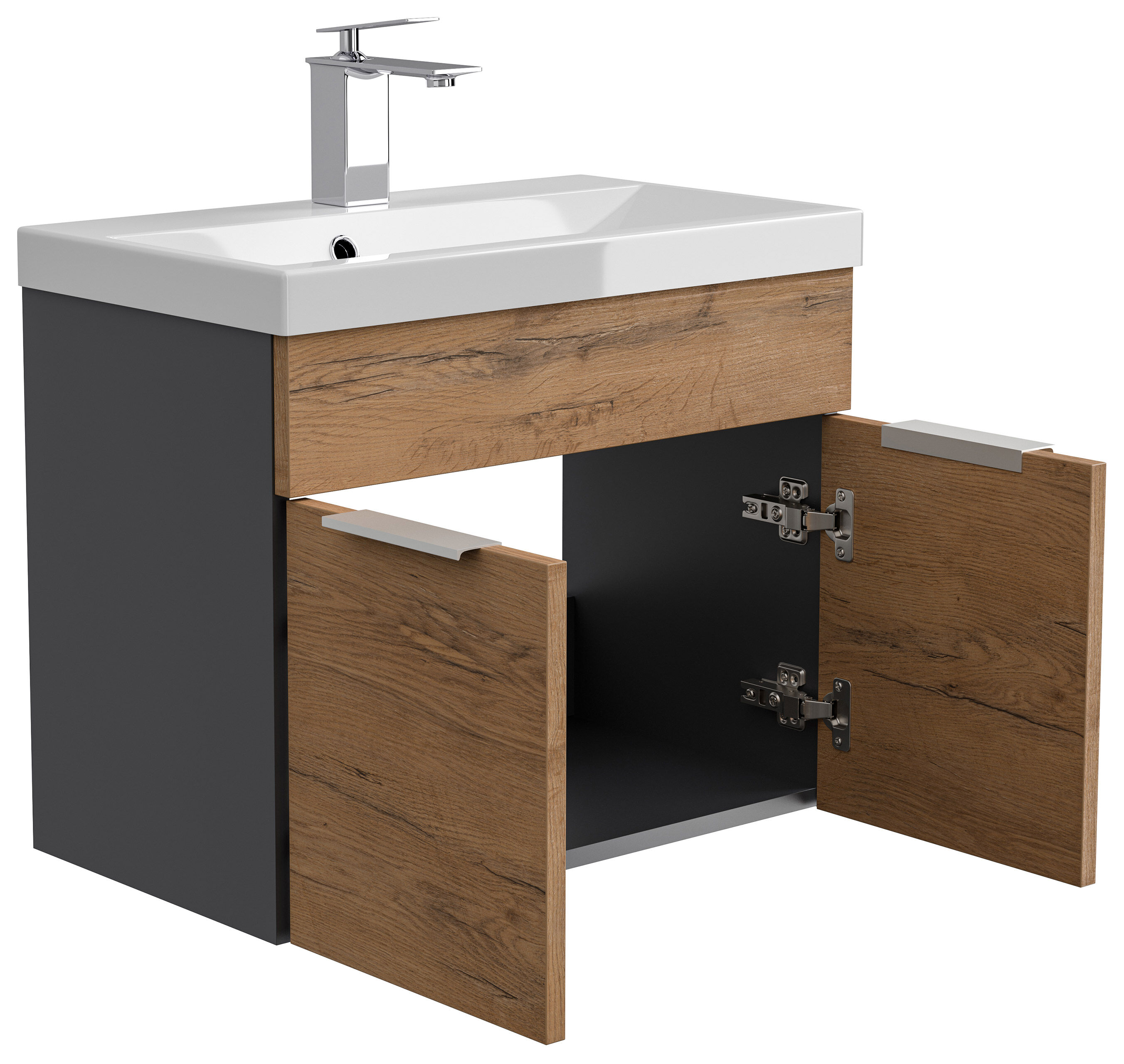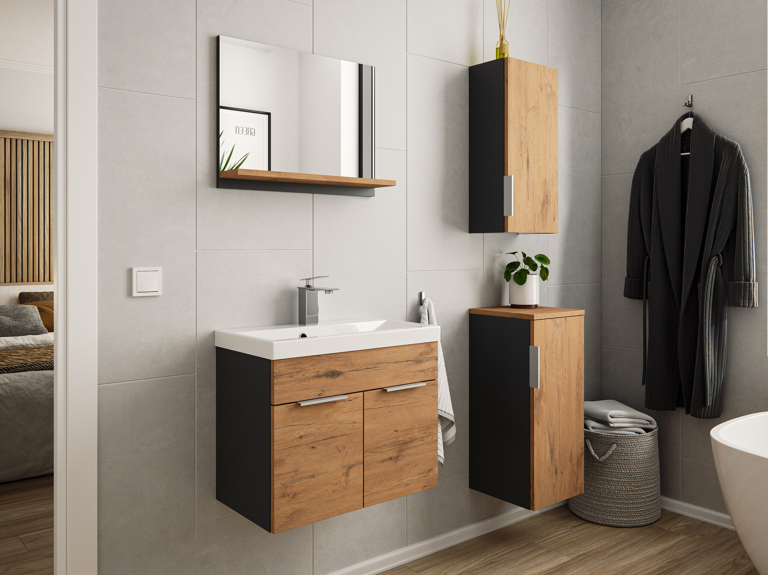 Badmöbel-Set Slimline Vega 4tlg mit Spiegel & Midischränke Oak/ grafit matt