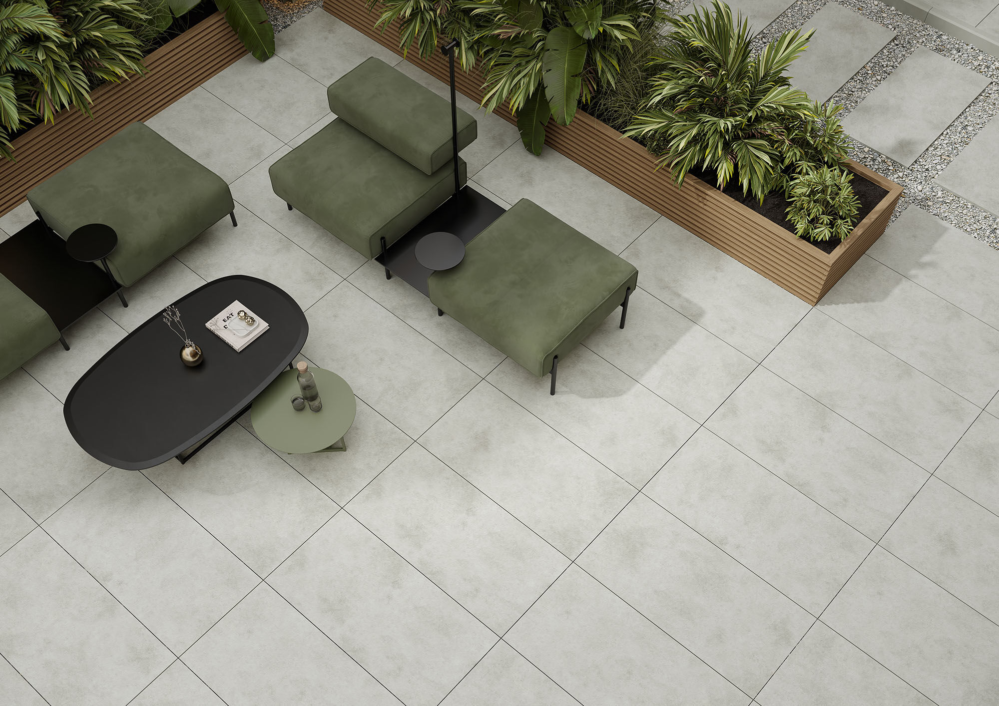 Die Kollektion FOG überzeugt mit einer modernen Betonoptik und ermöglicht die Gestaltung offener, durchgängiger Wohnlandschaften – ganz ohne sichtbare Übergänge zwischen Innen- und Außenbereichen.