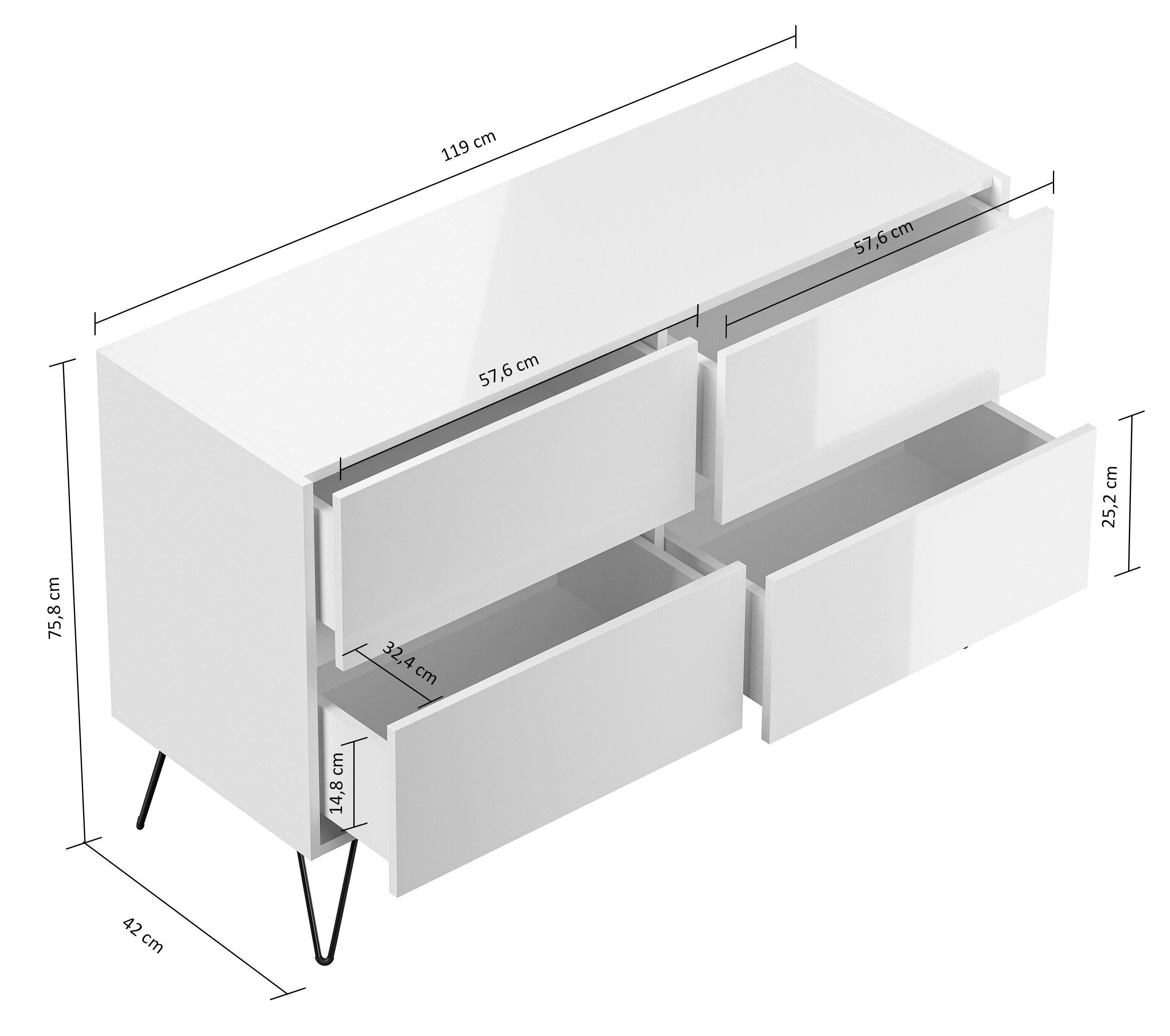 Kommode Dion 120cm 4 SoftClose Schubladen Weiß hochglanz