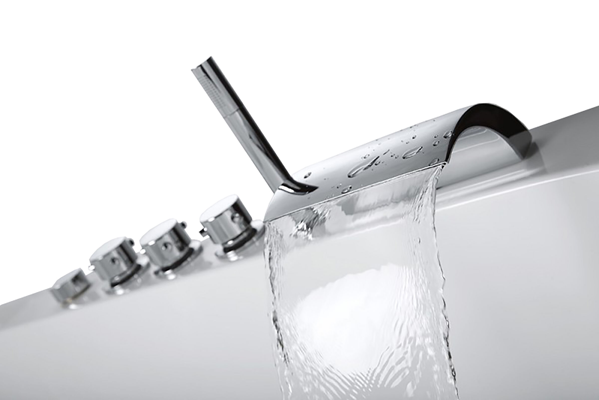 Zur kompletten Standard-Ausstattung gehören die 3er-Armatur (verchromte Messingarmatur mit Kunststoff-Kartusche), die Standard-Handbrause sowie der Wasserfall.