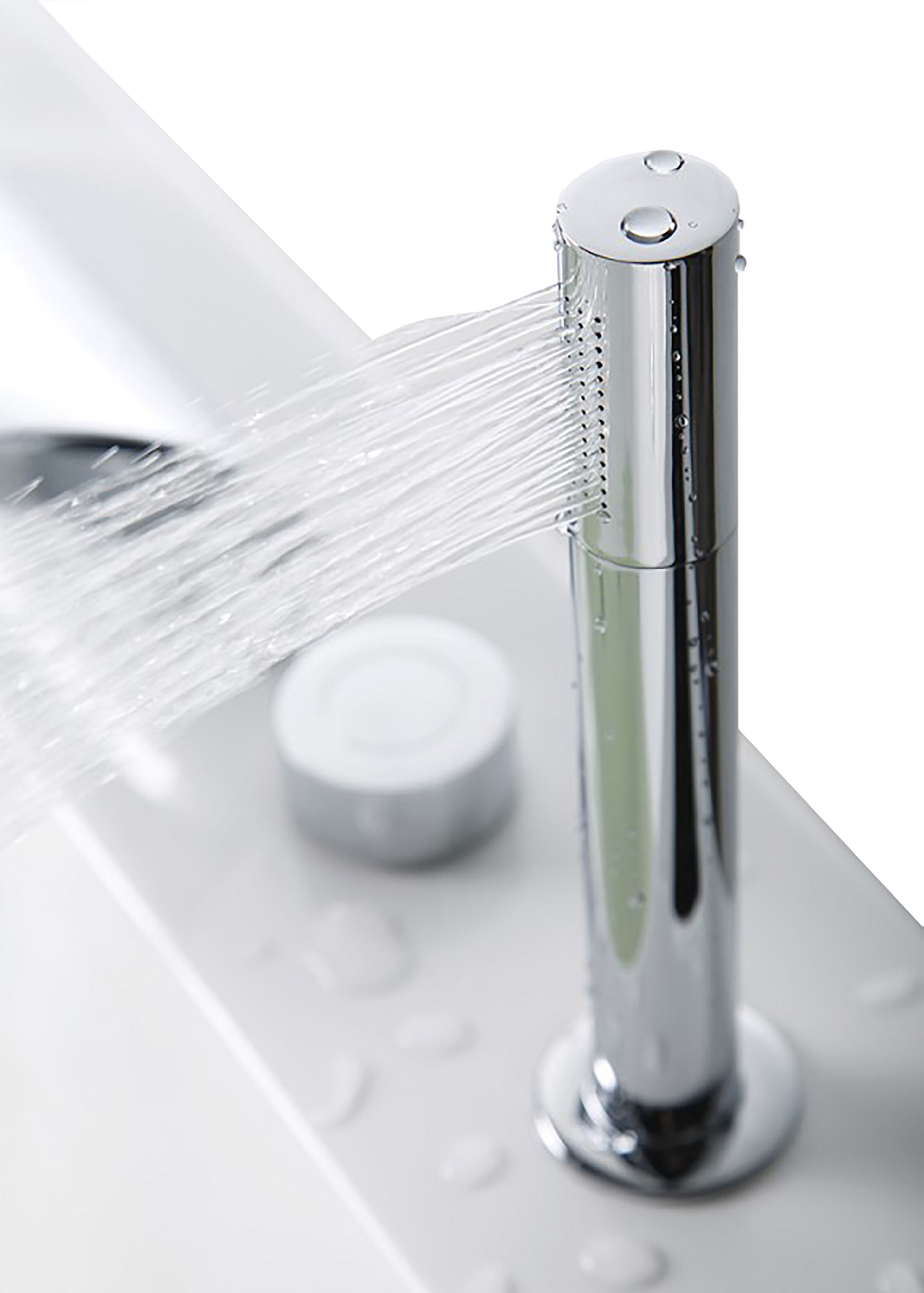 Tauschen Sie die Standard- auf die Upgrade-Armatur-Ausstattung. Zum kompletten Armatur-Upgrade gehören die 2er-Armatur (Kalt- und Warmwasser-Einhand-Mischer ⁄ Umschalter), die Upgrade-Handbrause der Marke Koller (versenkbar und mit Tropfwasserabführung) sowie der Wasserfall.