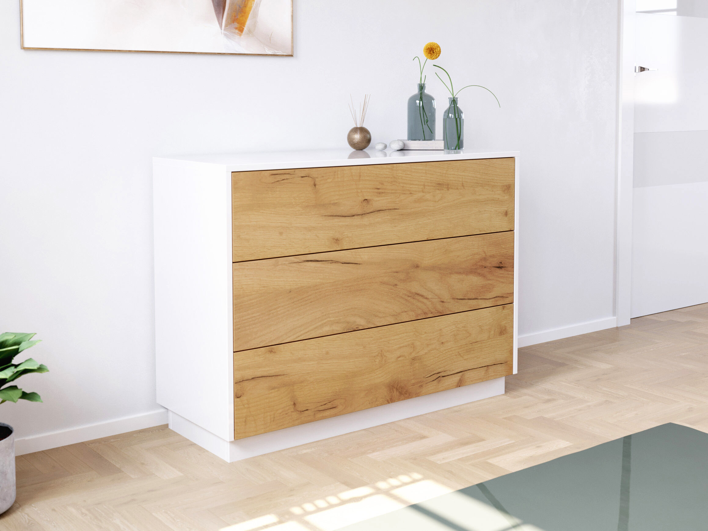 - Innenleben: Mit mattfarbenem Melamin sind die Schubladen beschichtet, in der Regel ebenso ggf. die Innenflächen der Rückwände und Türen.
