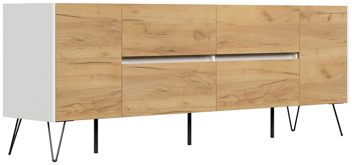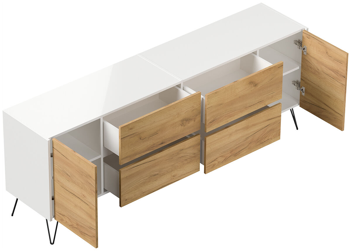 Sideboard Yako 200cm 2 Türen 4 Schubladen Weiß Hgl mit Eiche Fronten