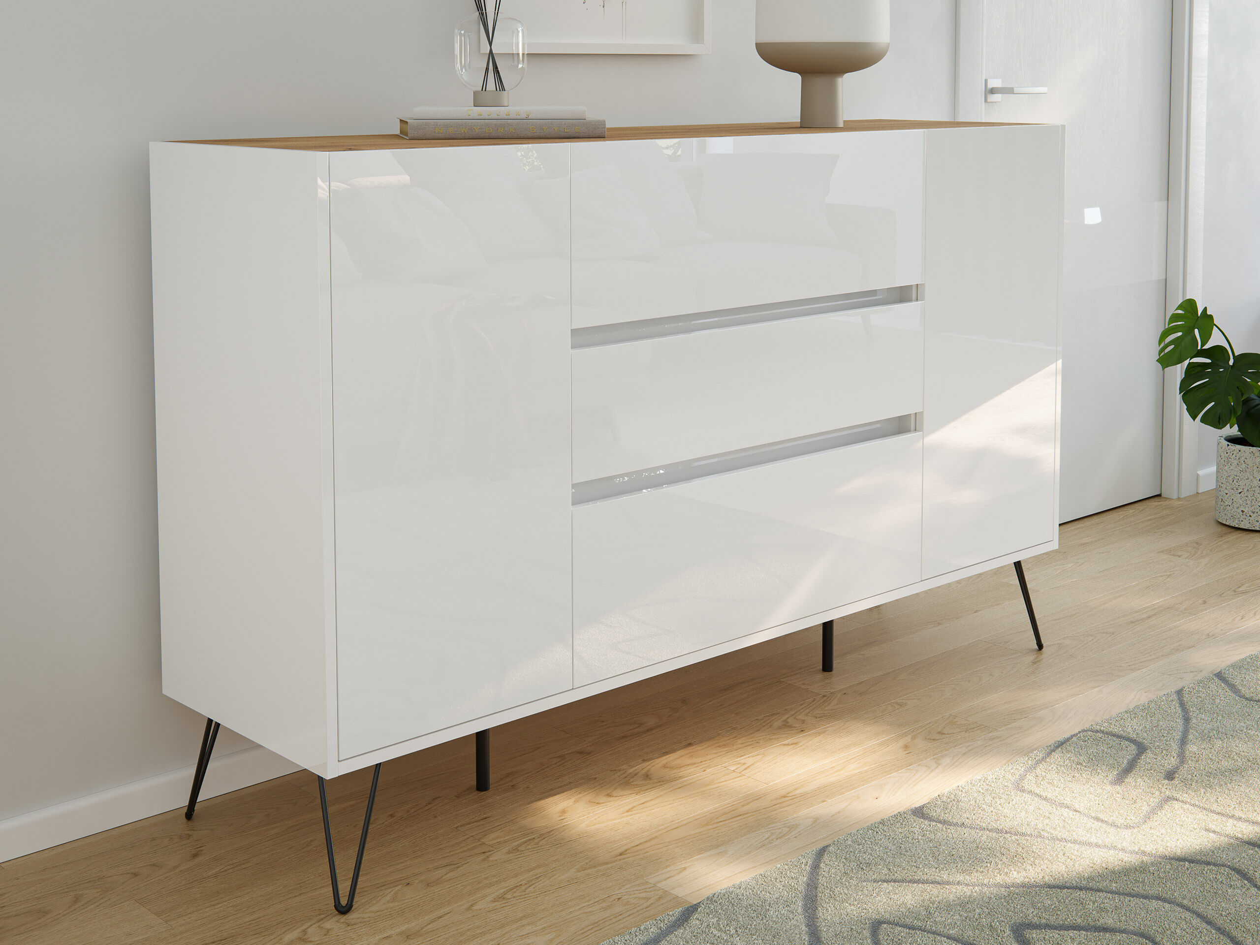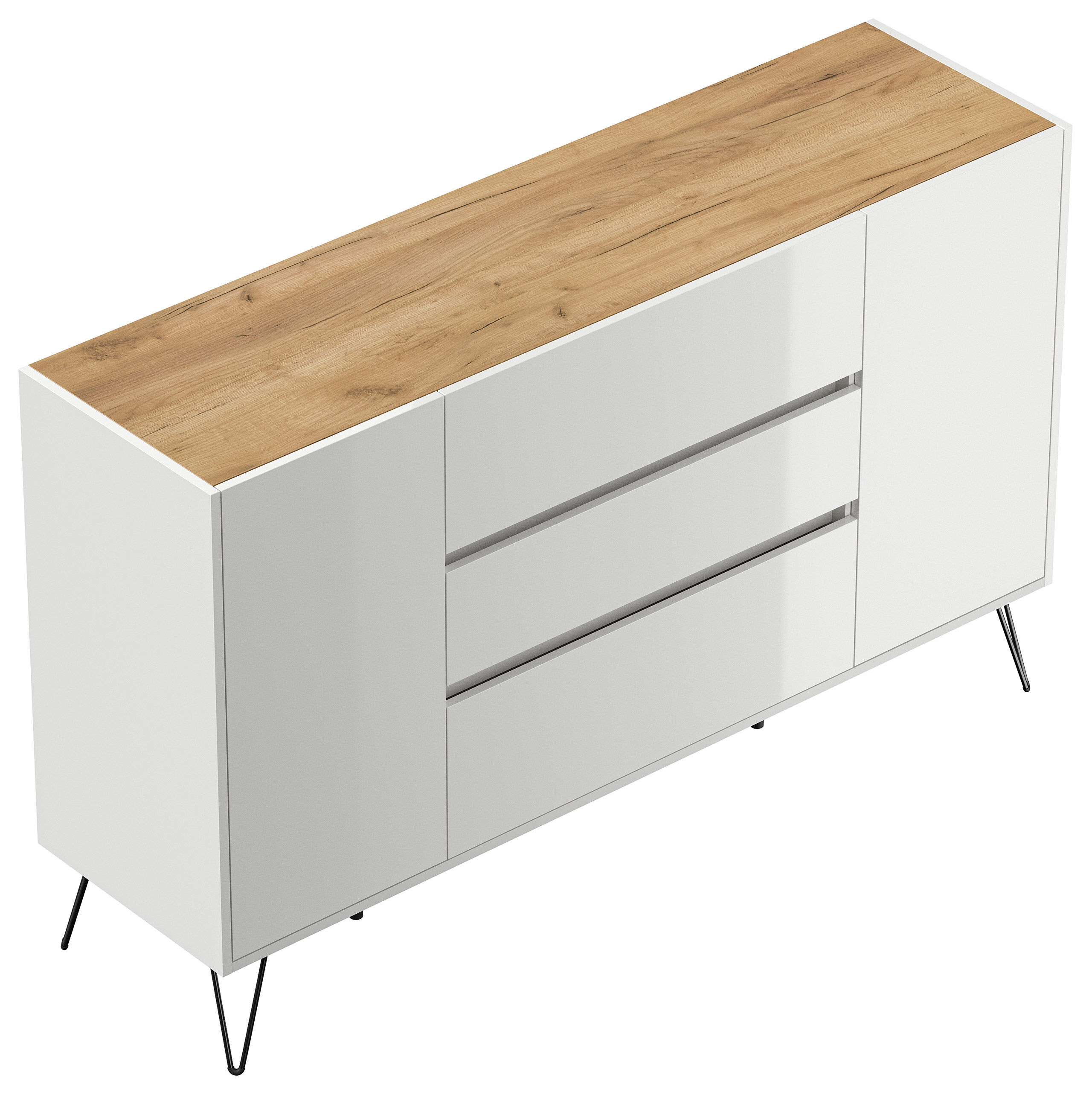 Sideboard Yako XL 155cm 3 SoftClose 2 Türen Weiß/Eiche Top