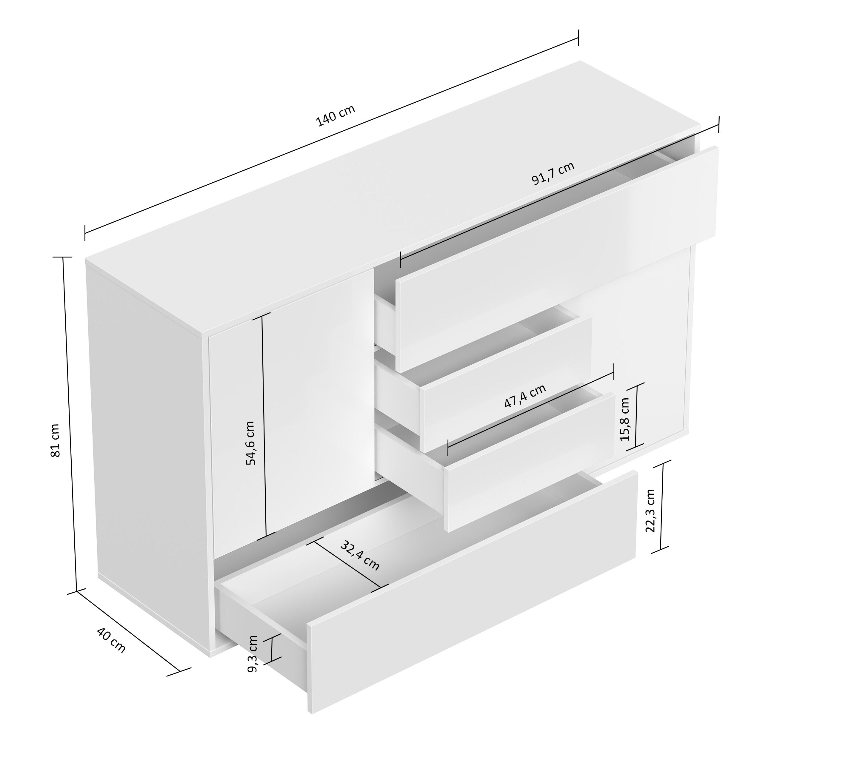 Sideboard stehend Karat A 140cm 2 Türen 4 Pushauszüge Weiß Hgl