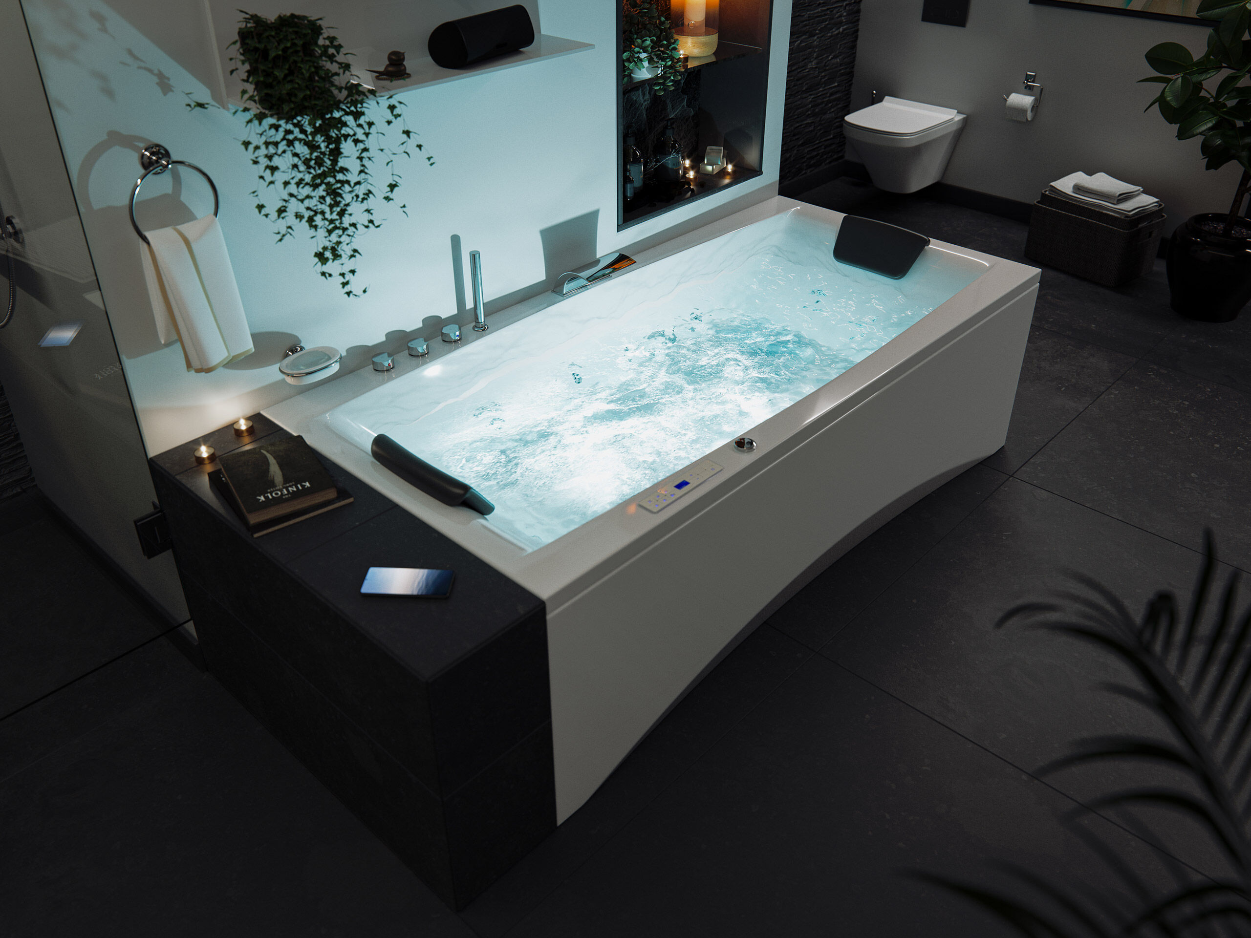 Vorteile: Dezente Strahler seitlich. Automatischer Farbwechsel mit gleichmäßiger Wasserbeleuchtung. Intensive Farben leuchten unter Wasser. Entspanntes Baden mit Chromotherapie.Massagefunktion: Düsen-Ausstattung