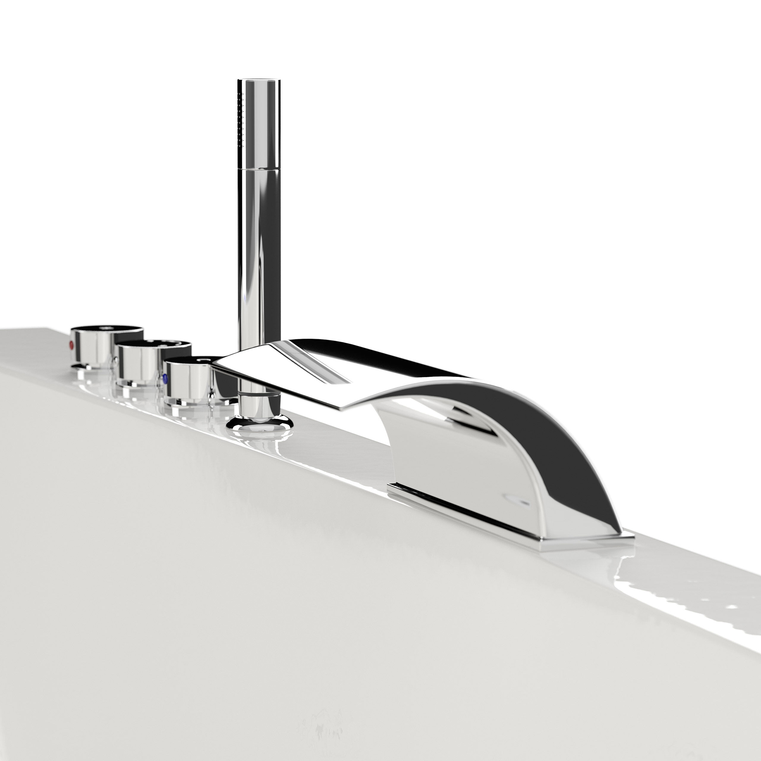 Zur kompletten Standard-Ausstattung gehören die 3er-Armatur (verchromte Messingarmatur mit Kunststoff-Kartusche), die Standard-Handbrause sowie der Wasserfall.