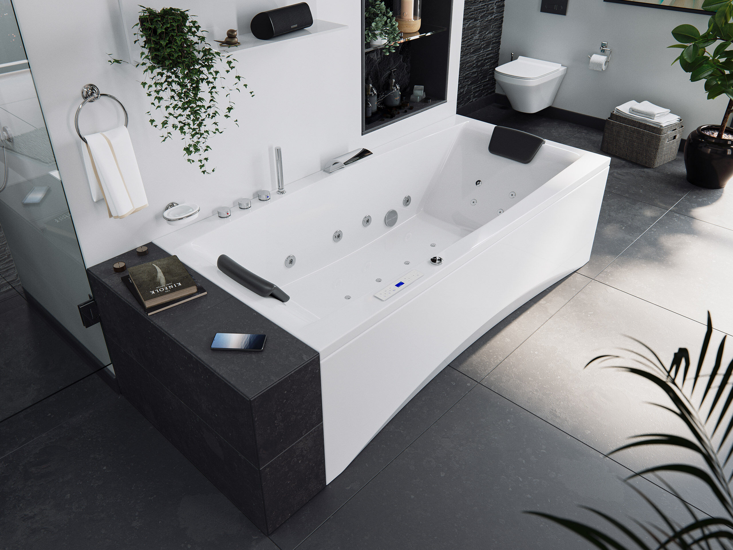 - Anschlussfertige Whirlpool-Wanne (Made in Germany) mit Rahmen auf höhenverstellbaren Füßen.